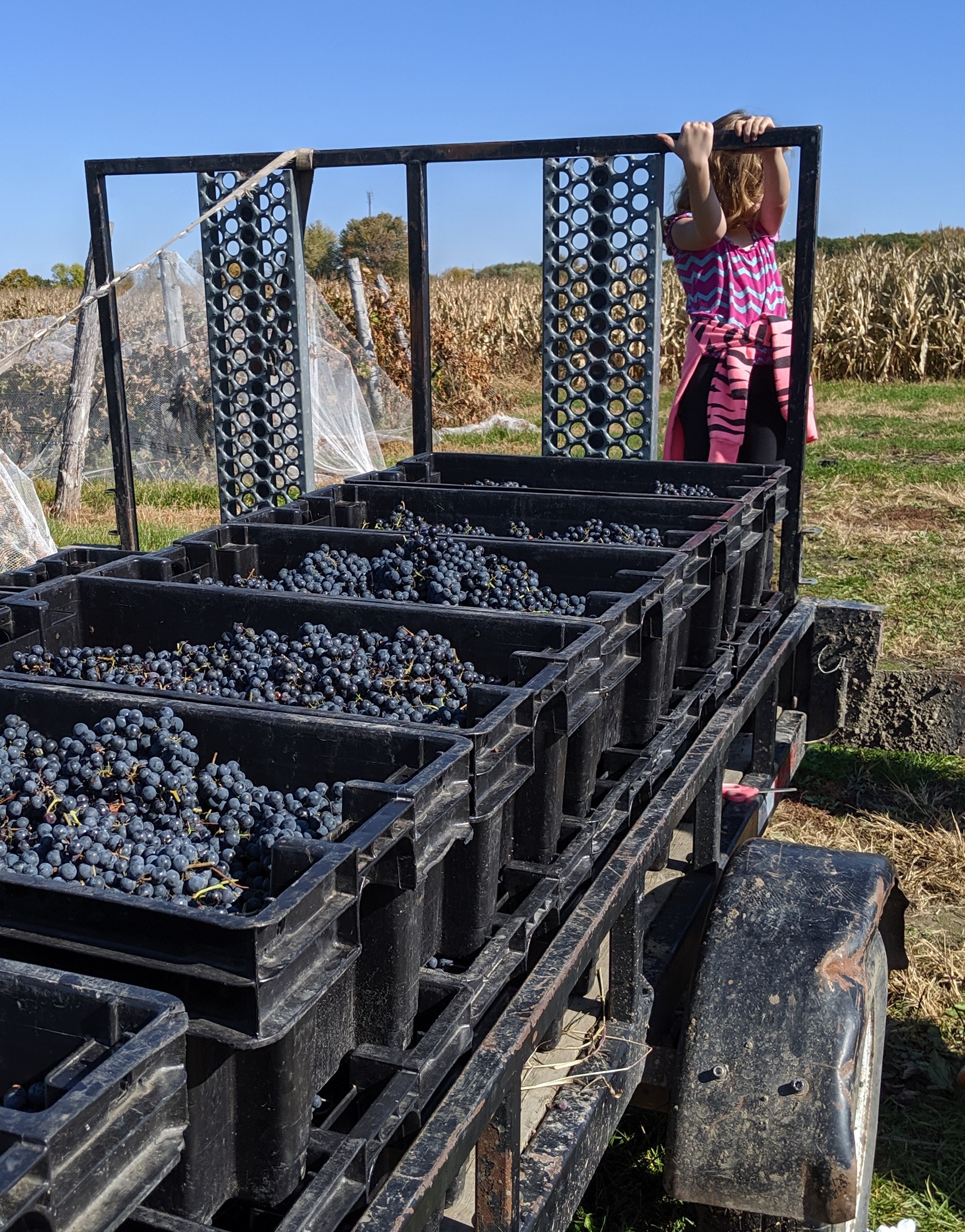 After a quick breakfast of croissants and coffee, the volunteers followed the tractor out into the vineyard to spend the morning picking Baco Noir grapes. Time flew as the volunteers picked 4 or 5 harvest bins each.